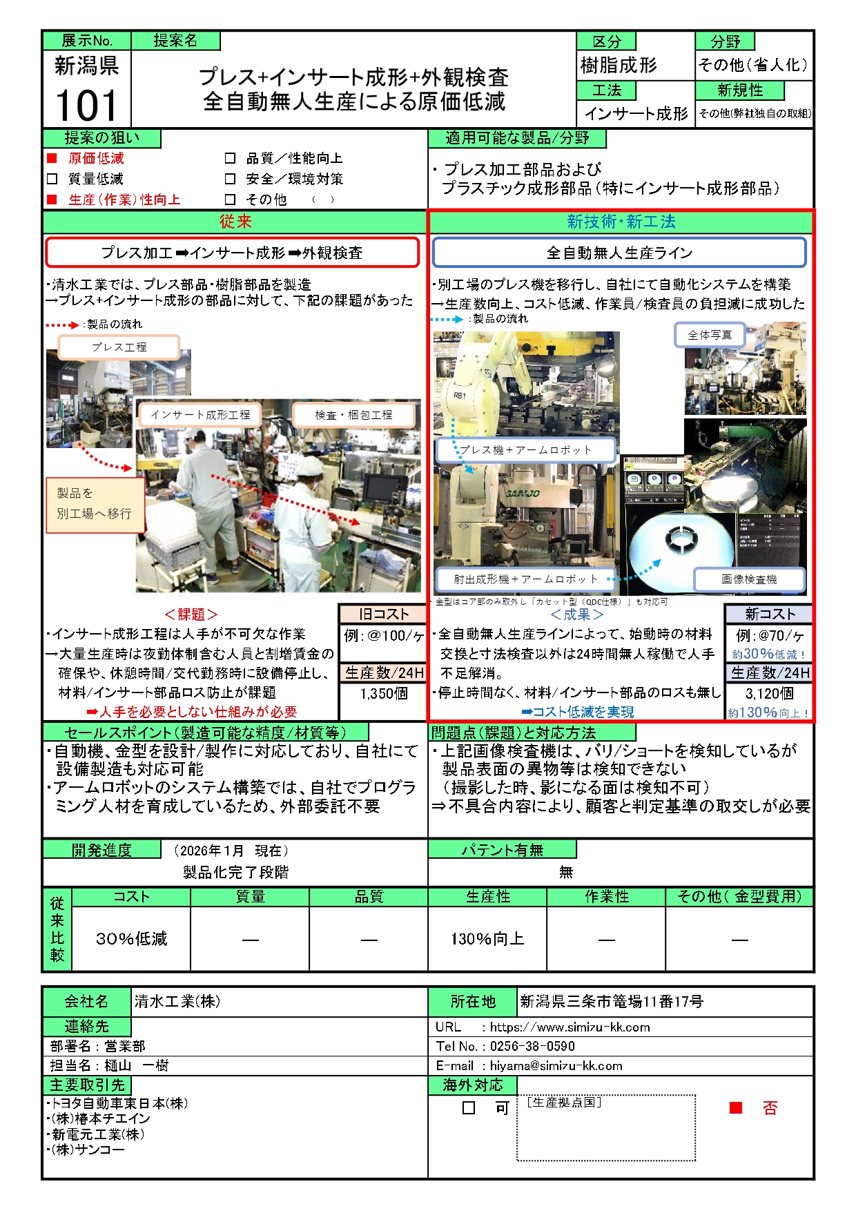 プレス+インサート成形+外観検査 全自動無人生産による原価低減