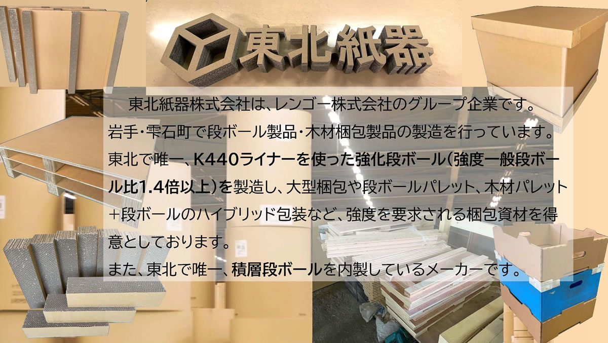 段ボールをベースにした独自開発商品(特に重量物包装)でオンリーワン企業を目指しています。当社はレンゴーグループ企業であり、レンゴー本体(全国27工場)、グループ企業(国内122社・海外250社)での連携で広いニーズに対応可能です。
